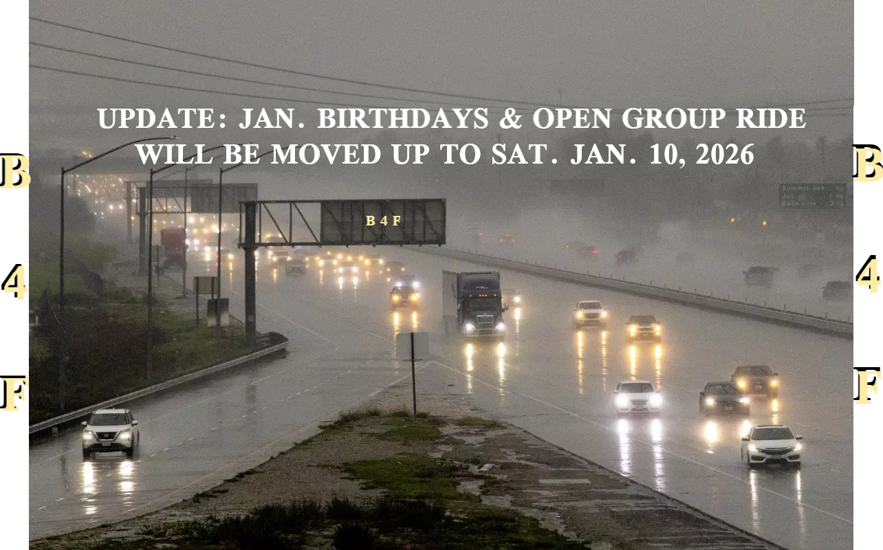 THE FIRST SATURDAY OF EACH MONTH WE CELEBRATE THAT MONTHS BIRTHDAY RIDERS AS WE RIDE IN UNITY AND WELCOME PATCH CLUBS, SPORT BIKES AND CHOPPERS ARE INVITED TO SHARE THE ASPHALT. B4F RIDERS ARE SPREAD THROUGHOUT SOUTHERN CALIFORNIA AND WE PROMOTE SAFETY & RESPECT.