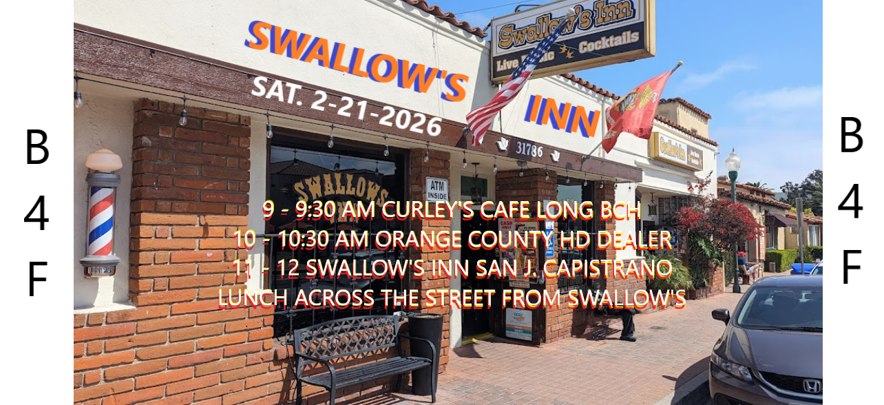 WE'RE INDEPENDENT COED RIDERS IN SOCAL WE RIDE WITH ALL MOTO ENTHUSIAST BE IT SPORT, TRIKE, MOTORCYCLES & CHOPPERS! 9 - 9:30 AM MEET GOLDEN CORRAL BUFFET, 17308 BELLFLOWER BL, BELLFLOWER, CA 90806 DIRECTIONS 9:45 - 10:20 AM MEET LAIDLAW HD DEALERSHIP, 1919 PUENTE AVE, BALDWIN PARK, CA 91706 DIRECTIONS LUNCH MT. BALDY LODGE RESTAURANT,